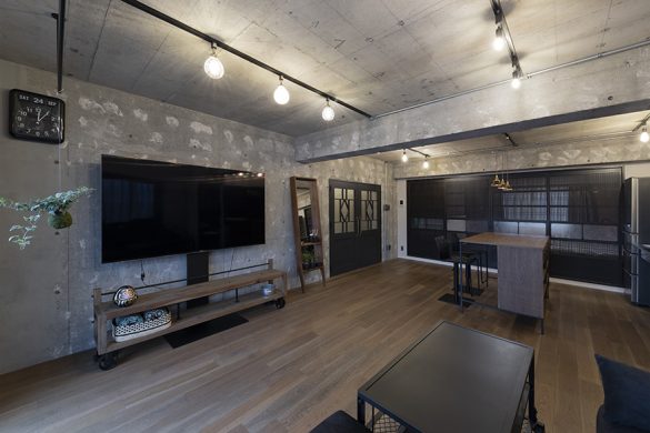 △△△こちらのリノベ事例は、テレビ背面の壁が壁式構造の躯体壁。構造なので壊せませんが、リノベ事例のようにコンクリート面をあえて見せるデザインが可能です。