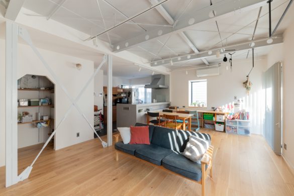 △△△鉄骨造戸建てのリノベ事例。鉄骨造の特徴は天井のデッキプレートや鉄筋のブレース。こうした部分をあえて見せることで、木造やRC造と違ったデザインに仕上がります。