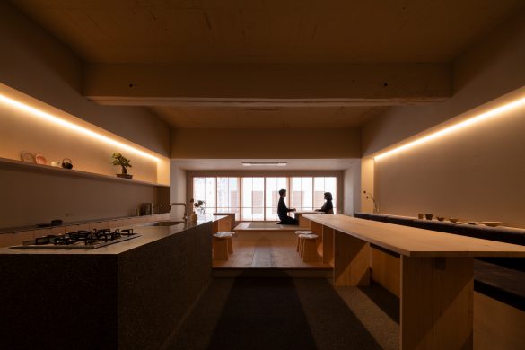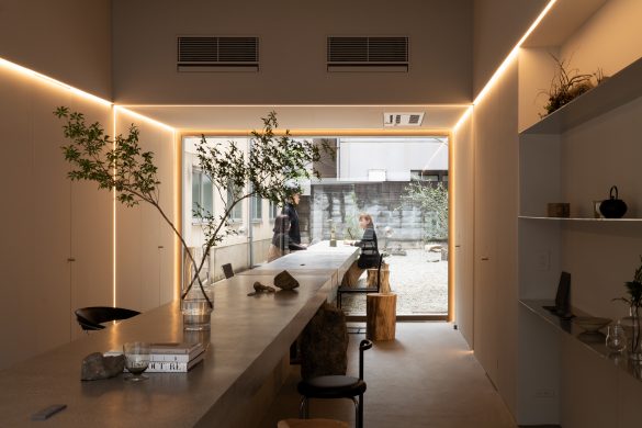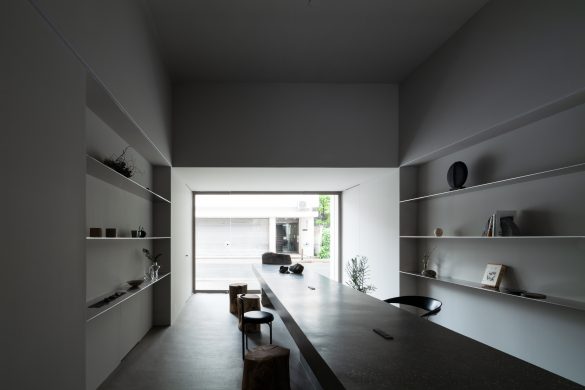 商業と住宅が混在する地域において、街に開かれたギャラリー兼オフィス兼ショールームを実現した事例である。長細い空間を活かし、両端に開口を設けて自然光と視線の抜けを確保している。落ち着いた素材選択と連続的な構成により、展示・執務・商談など多用途に対応する柔軟性を備えている。敷地のコンテキストを読み取り街との接点を意識した構成や、シンプルな箱型の既存空間に高低差や光の操作を加え、奥行きや変化のある豊かな内部空間が生み出されている点が魅力であり設計者の手腕が感じられる。