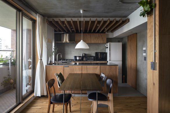 ですが、こちらの事例ではキッチンの床高さを下げることで、キッチン天板とダイニングテーブルがフラットにつながったデザインを実現しました。