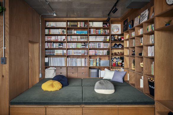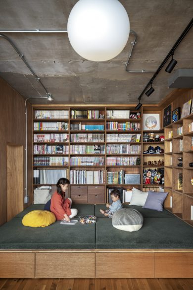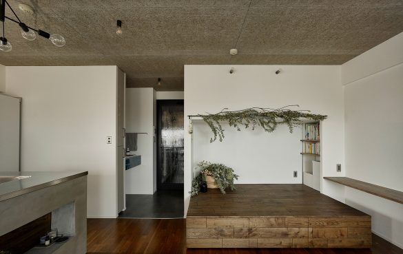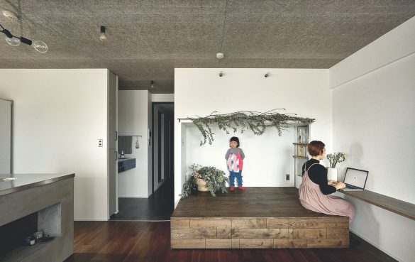 リビングなどの一角を、腰掛けやすい30〜40cm前後の段差で持ち上げることで、空間をゆるやかにゾーニングします。