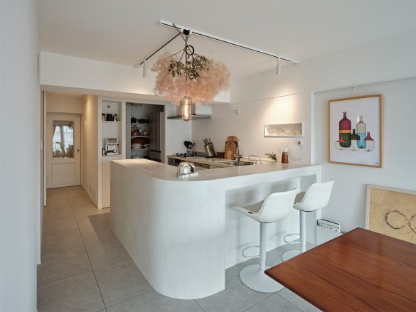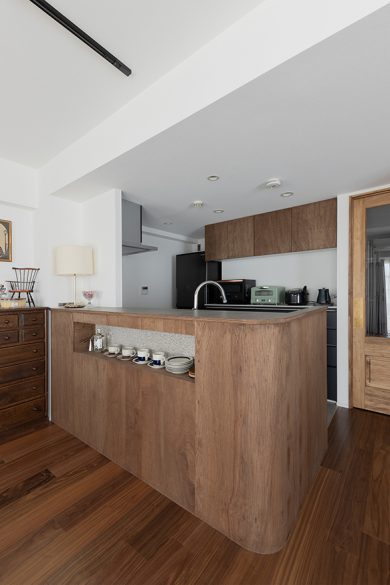 ハコリノベのキッチン事例では、キッチンやカウンター背面にニッチを作る事例も多いですよ▼▼▼