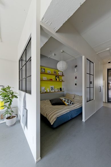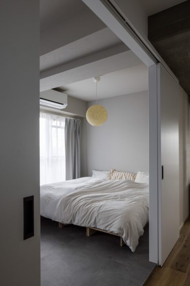 一般的なワンルームとは異なり、生活のゾーンの間に距離感が保たれているため、空間全体にメリハリが生まれ、落ち着いた印象を受けます。