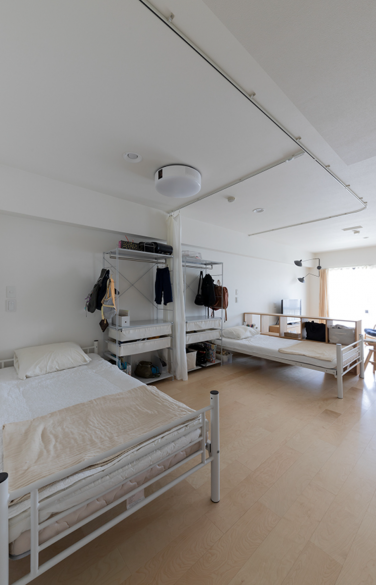 注目したいのは、LDKの中に設けられた子ども用のスペース。リビングの一角には、カーテンで仕切ることができるベッドスペースがあり、現在は子ども2人の為の場所として使われています。