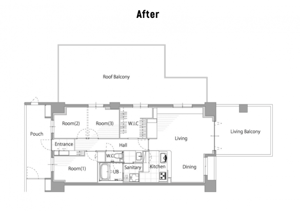 また、この住まいのもう一つの魅力が、大きなルーフバルコニーの存在です。リビングとつながる開放的な屋外空間は、日常の暮らしを豊かにするだけでなく、物件としての希少性も高めています。