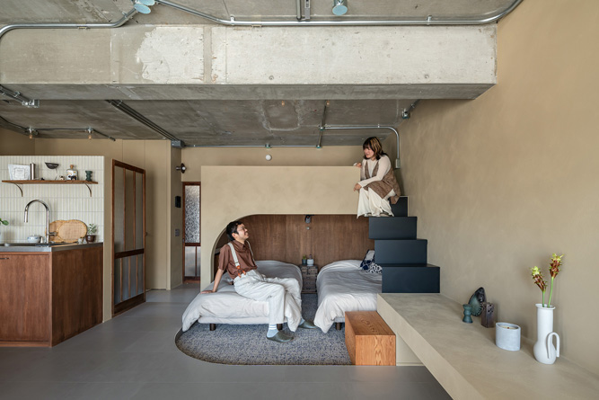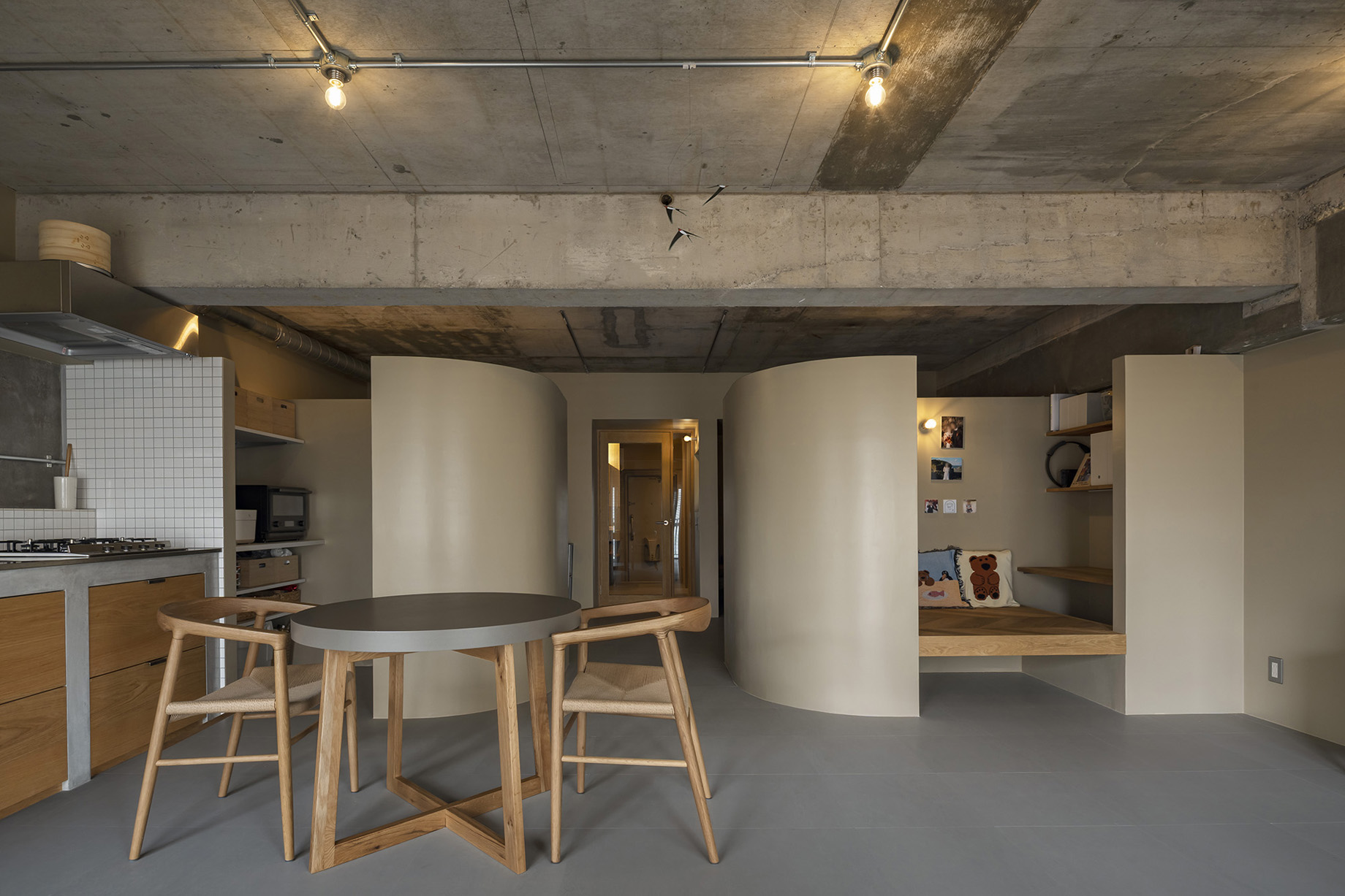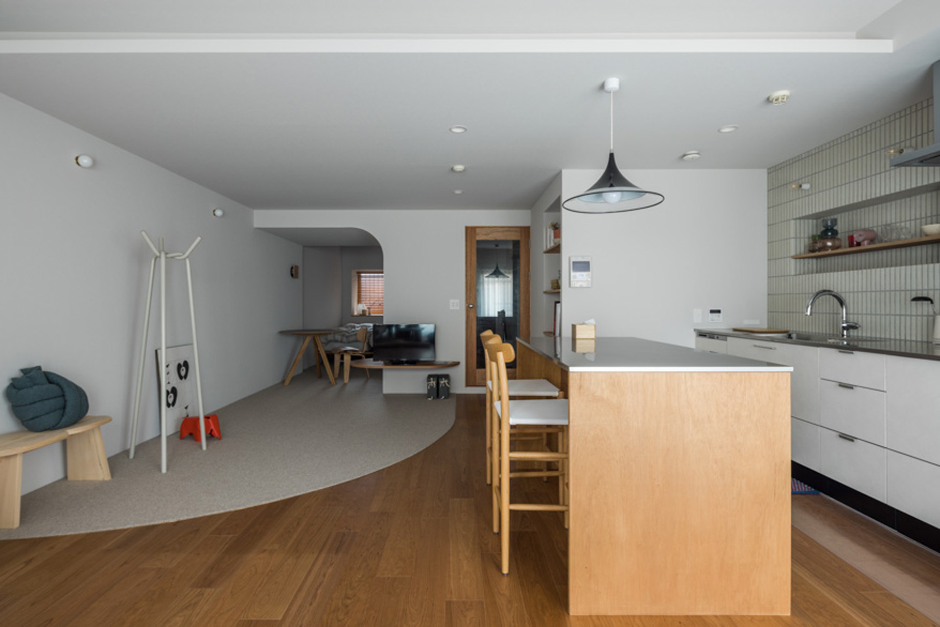 カーペットの上でゴロゴロしていても、キッチンで料理をしていても、ベッドで静かに休んでいても。それぞれが思い思いに過ごしながら、同じ空間を共有している安心感を大切にした住まい。ひと続きのワンルームのような開放感と、少し閉じたようなプライベート感の両方を合わせもつ間取りが特徴です。天井や床、カウンターに取り入れたアールが、壁の代わりとなってやわらかに空間を整えます。各スペースは用途を限定せず自在にアレンジ可能で、日常にもゲストシーンにも柔軟に対応できるレイアウトに。同じ空間にいる安心感と、自分のペースも大切にする、そのバランスが暮らしの豊かさにつながります。