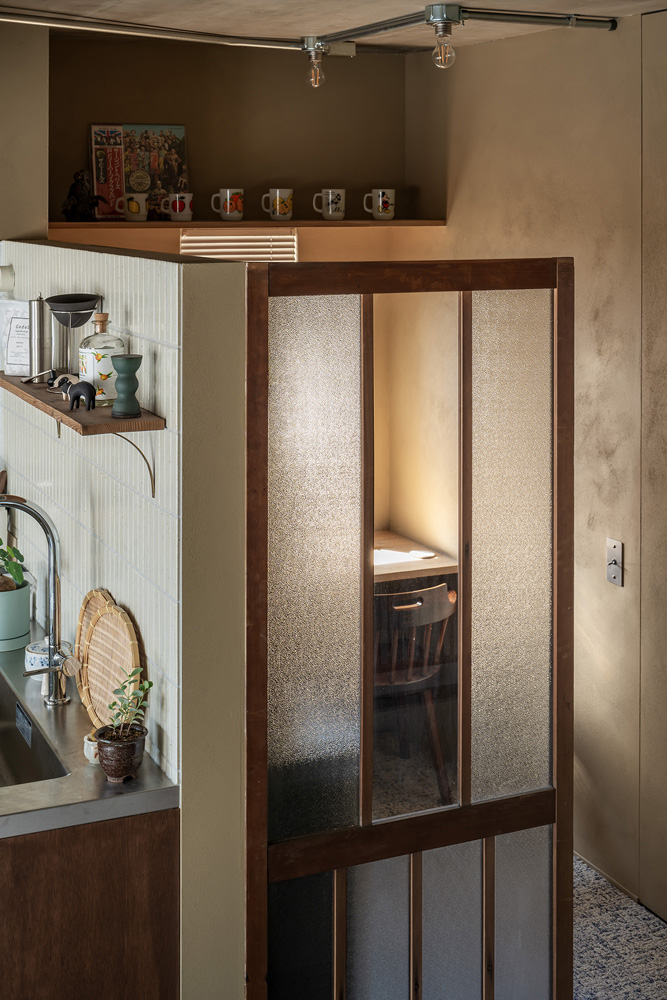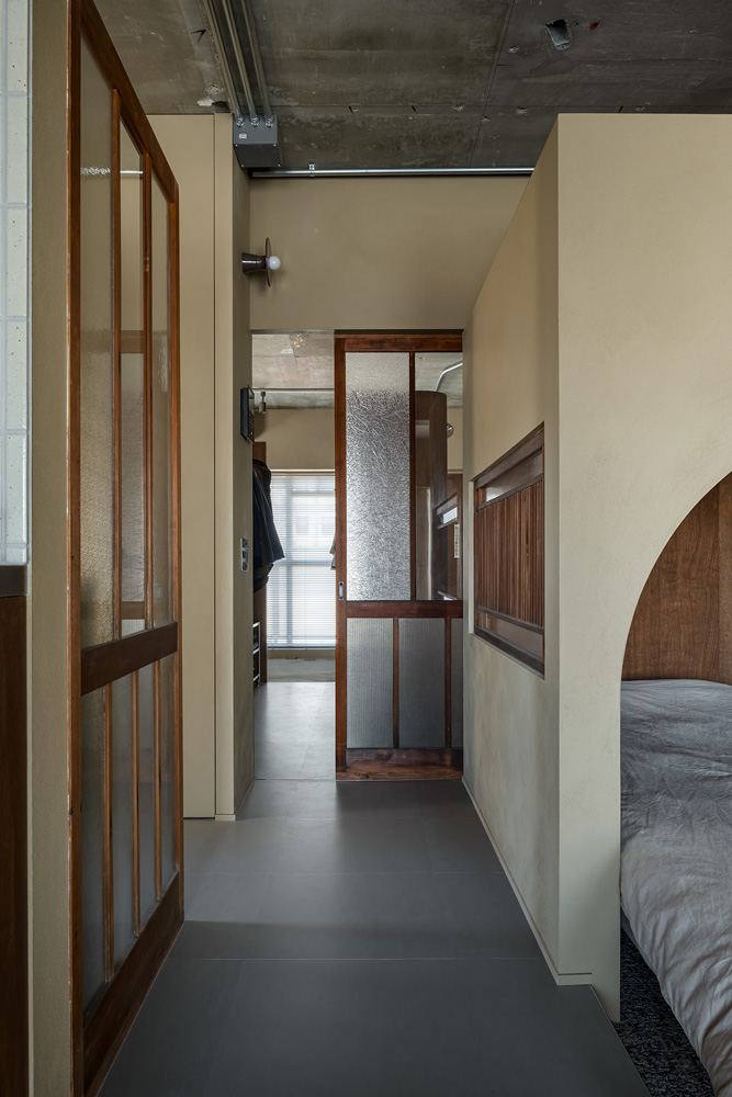 古建具とロフト、キッチンやウォークスルークローゼットを間仕切る壁、すべての高さを1780 mmで揃えた住まい。この高さは取り壊し予定の遊郭から譲り受けた古建具の高さに由来します。古建具を基準にした高すぎず低すぎない寸法は壁の高さとして圧迫感が少なく、天井がより高く感じられる効果も。ご夫婦それぞれのスペースも1780 mmで囲うことでお互いの気配を感じつつ、自分時間を思い思いに過ごせるようになりました。古建具は住まいの軸となり、新たな場所で時を重ねていきます。