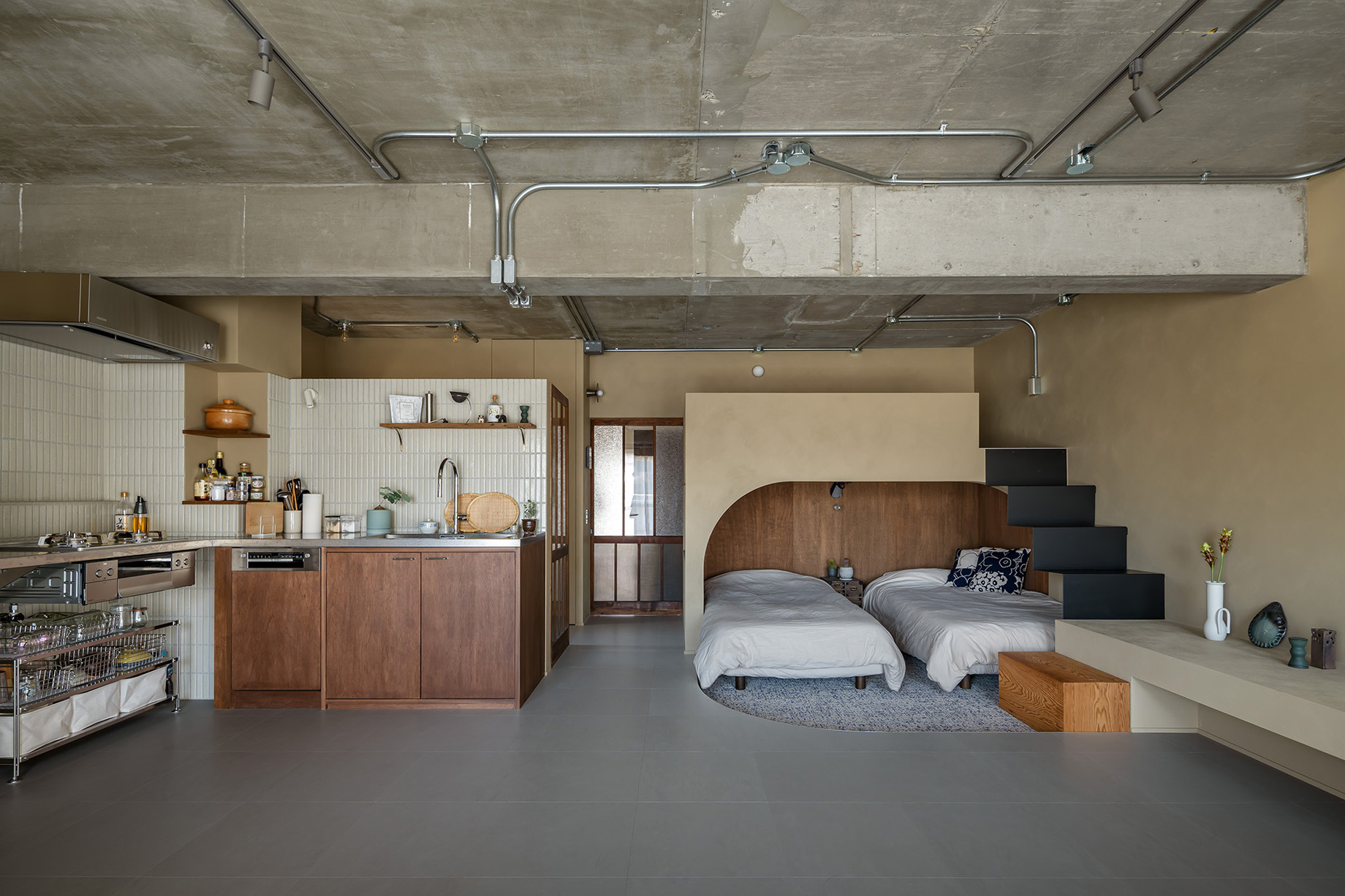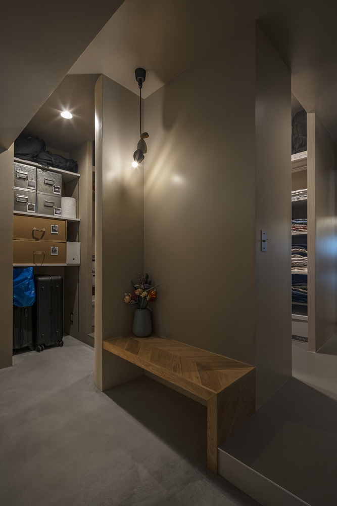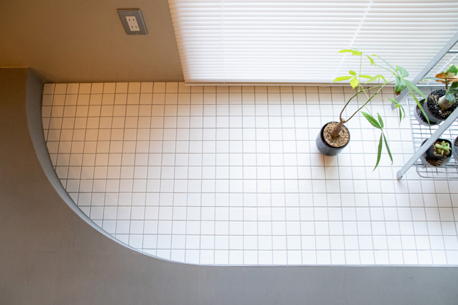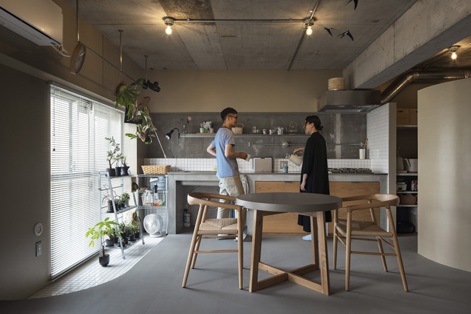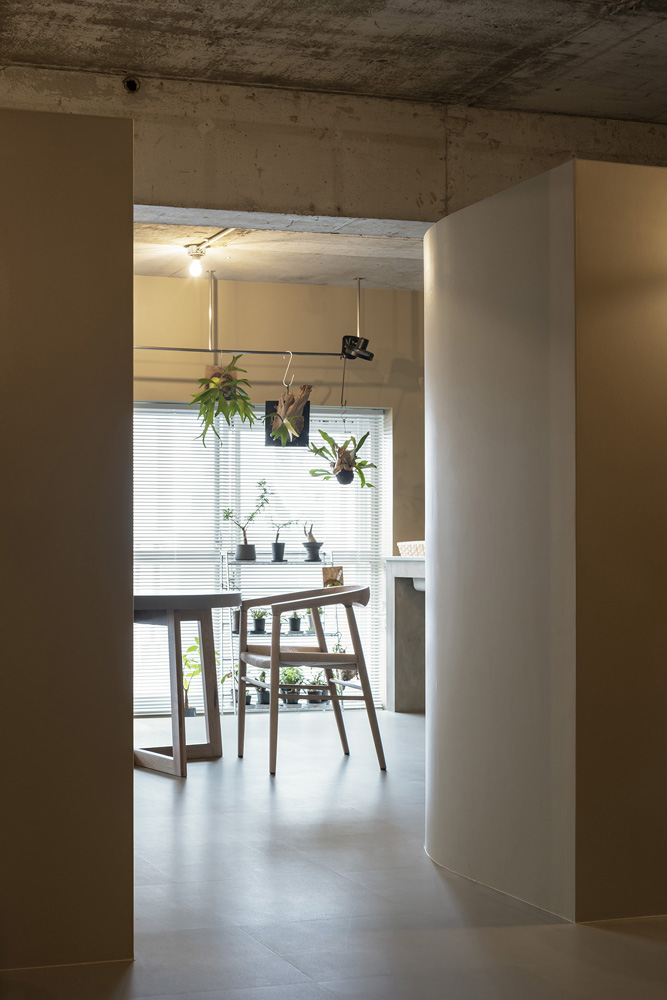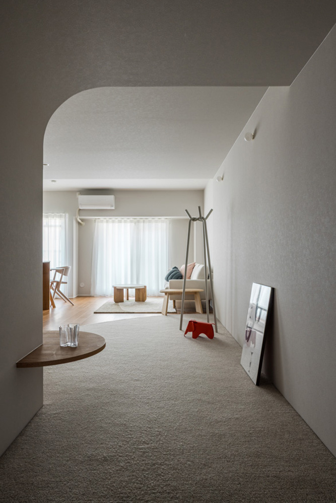 Aesopの店舗のような雰囲気をイメージして素材選びやカラーの選定を進め、リビングに隣接する寝室の壁をゆったりとしたアール壁で提案。枠なしのドアも壁と一体感があり、フラットな印象に。天井は梁のみ躯体現しにしたことでキッチン腰壁のモルタルとのバランスも取れ、結果的に空間の良いアクセントになっています。洗面スペースは廊下に独立しており、大きなアーチ開口とラワン仕上げの小口がポイント。玄関すぐの部屋は土間とWICにし、趣味のアウトドア用品もたっぷり収納できるように。将来家族が増え、それぞれに個室が必要になったときのことも想定して可変性を残したプランとなっています。