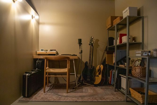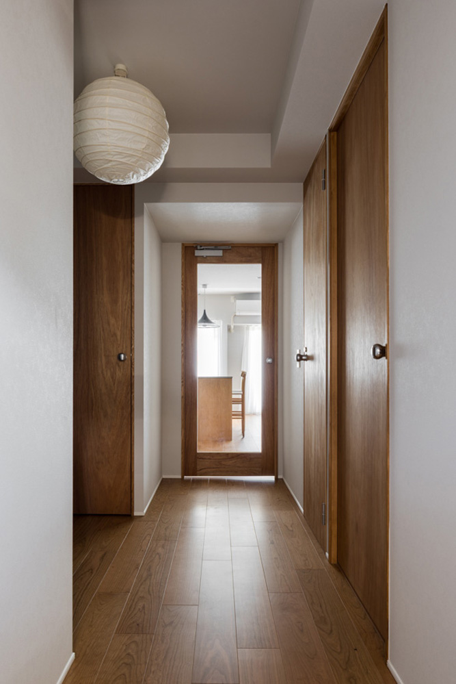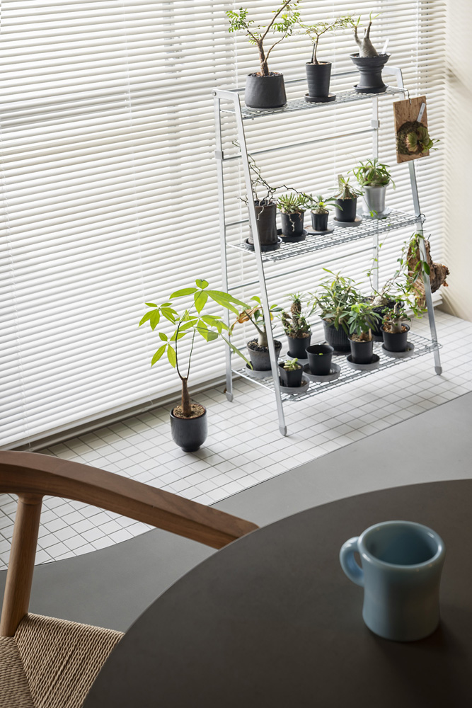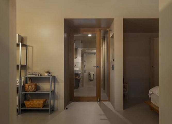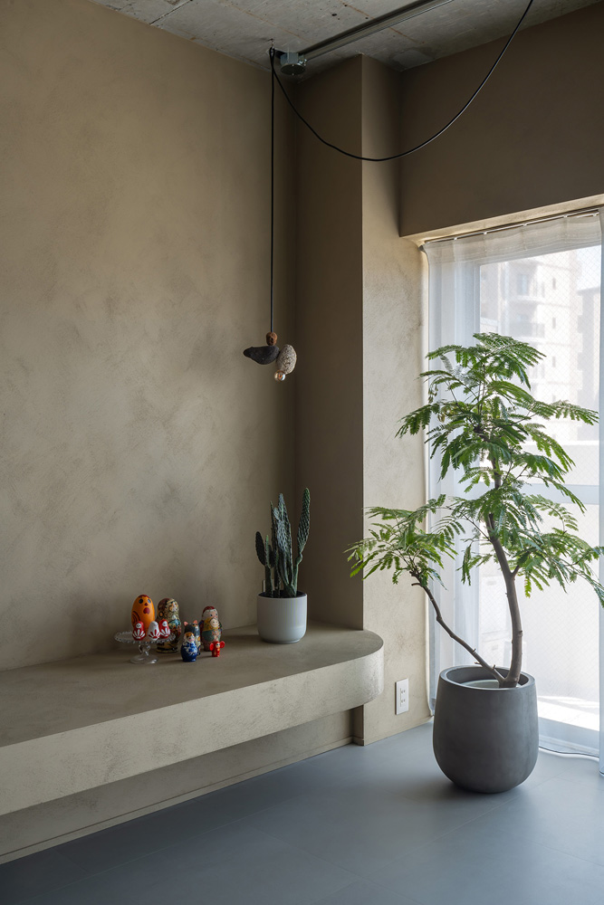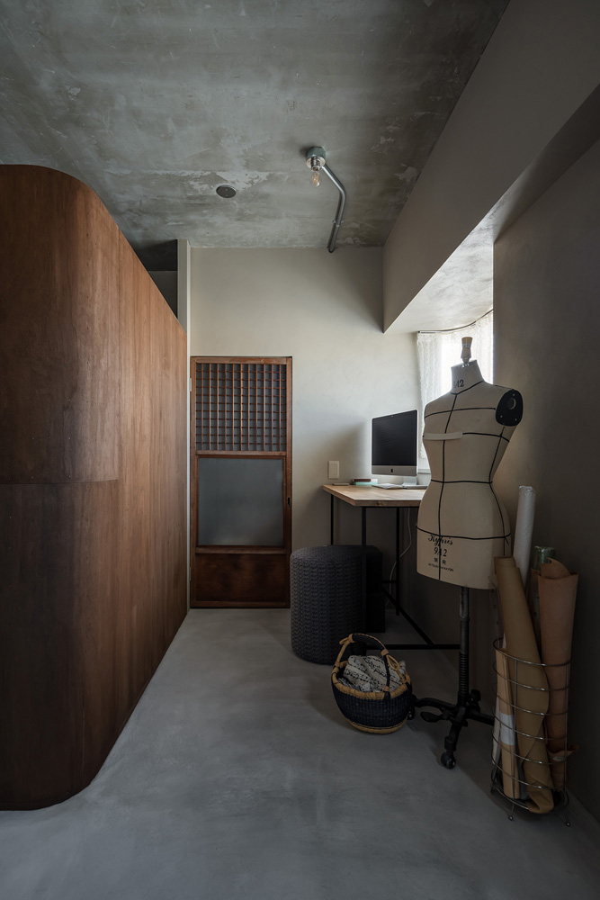 Aesopの店舗のような雰囲気をイメージして素材選びやカラーの選定を進め、リビングに隣接する寝室の壁をゆったりとしたアール壁で提案。枠なしのドアも壁と一体感があり、フラットな印象に。天井は梁のみ躯体現しにしたことでキッチン腰壁のモルタルとのバランスも取れ、結果的に空間の良いアクセントになっています。洗面スペースは廊下に独立しており、大きなアーチ開口とラワン仕上げの小口がポイント。玄関すぐの部屋は土間とWICにし、趣味のアウトドア用品もたっぷり収納できるように。将来家族が増え、それぞれに個室が必要になったときのことも想定して可変性を残したプランとなっています。