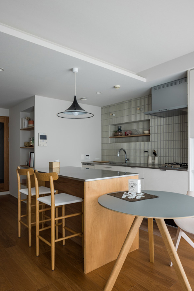 ご家族の趣味の小物や本や漫画。それらをただ収納する訳ではなく、見せて並べる本棚空間を作りました。休日は4人で小上がりの間で読書時間。小上がりの間には洗面側にもにじり口のような入り口を設け、キッチンや洗面からの繋がりが生まれます。施主様とのお話の中で日本のカルチャーを感じ、和の雰囲気を出せるような素材選びを心がけました。木を感じ、石を感じて、畳も障子もないけれど和を感じる空間。キッチン天井の木ルーバーは屋久島産杉、リビング壁面と玄関床には大谷石を採用し、洗面とキッチンの壁はモルタル左官で一続きにして壁で仕切らずとも素材で空間を分けるなど工夫を凝らしました。