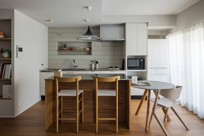 築古マンションに多い、ベランダ側にしかエアコンを設置することができないという制限に対し、無理に複数台のエアコンを設置するのではなく、1台で過ごせるよう空間をまとめるエコな選択を。LDKを区切るアール壁は高さを180cmに抑えたことで、奥まで視界が抜けるワンルームのような開放感が生まれました。また、あちこちに配したニッチ収納は施主様お気に入りのポイントです。機能とデザインの両面で日々の暮らしを心地よくするアイデアが散りばめられています。