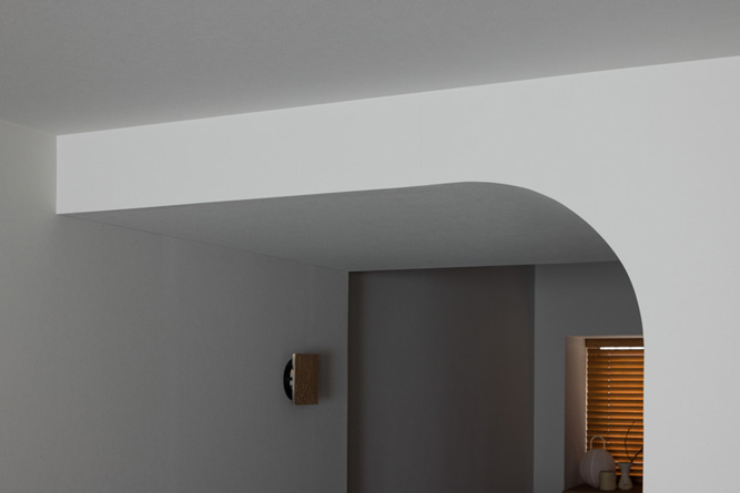 「モノよりコト、コトよりヒト」施主様が大切にされる想いがベースとなった空間づくりによって、人を基軸にした住まいができました。象徴的なLDKの「アール壁」は、お気に入りのホテルから着想を得たデザイン。ヌックやパントリーといった小さな場所も、アールでやわらかく囲うことで暮らしを印象づける場所に。壁や天井はベージュで塗装しアクセントにオーク材を使うことで、冷たさのある素材と組み合わせても、あたたかみを感じます。こうして一つ一つ丁寧に選ばれたものが日々の暮らしに自然と馴染み、唯一無二の住空間をつくり上げています。