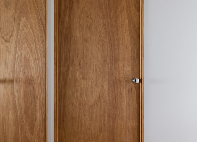 広さに限りのあるキッチンはⅡ型とし、収納や作業スペースを少しでも広く確保出来るように工夫。キッチン腰壁や吊り戸の扉面材は5mmのラワン材を小口に巻き込んだパネルを使用するなど細部へのこだわりも。