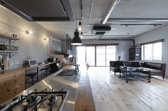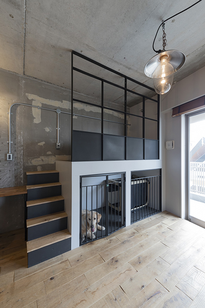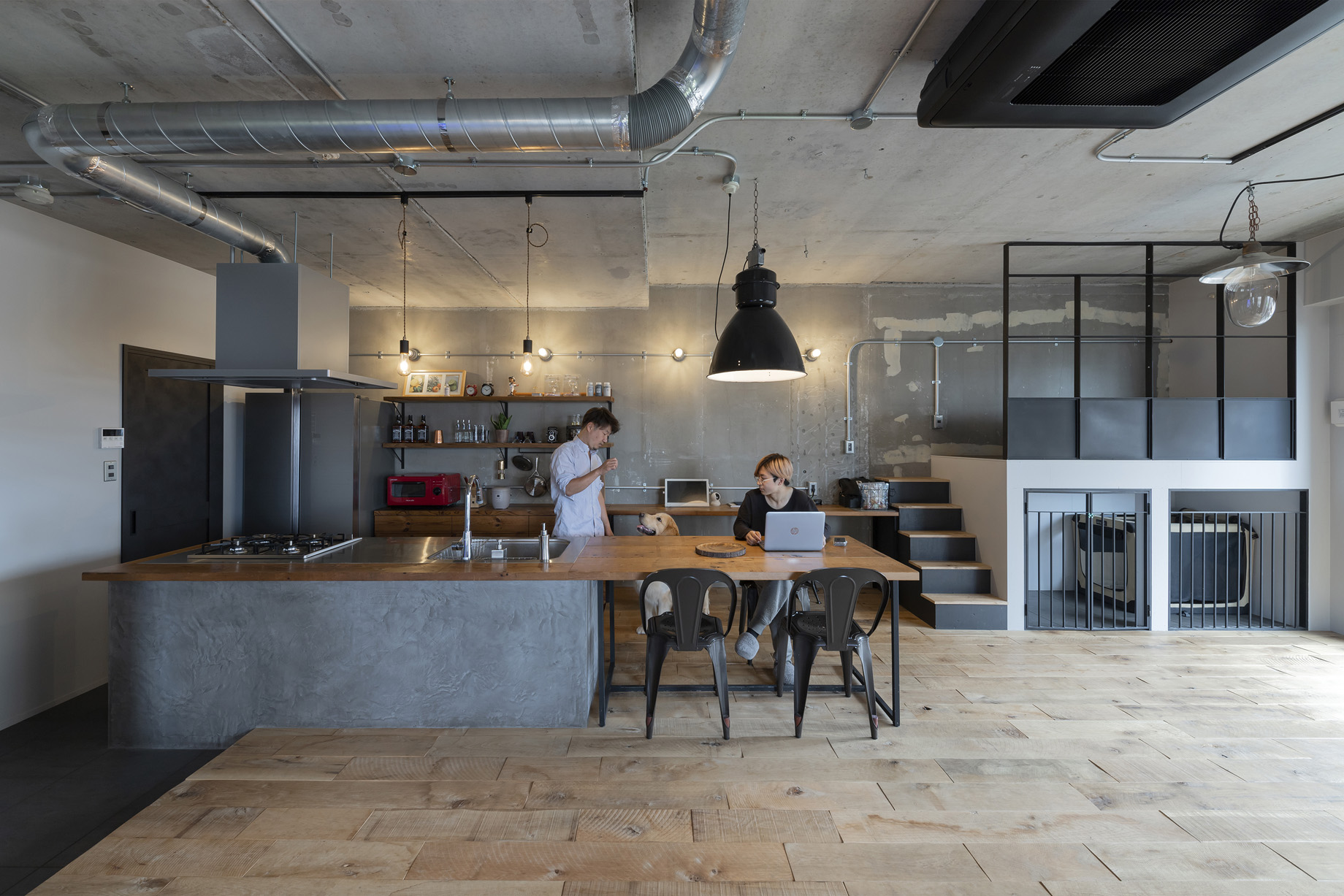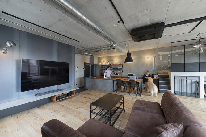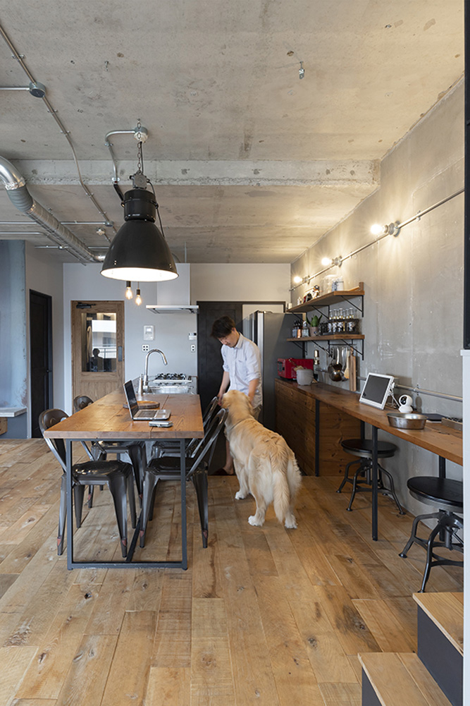 ご家族や新しく迎えた愛犬も住みやすく、インダストリアルな空間を目指しました。プリミティブオークの無垢フローリングは愛犬にとっても滑りにくく、傷が入っても味になるものを選定。一体となったキッチンとダイニングテーブルにはステンレスと厚みのあるサーモウッド材を使用し、床のレベルを変えることで高さを揃えてフラットに。