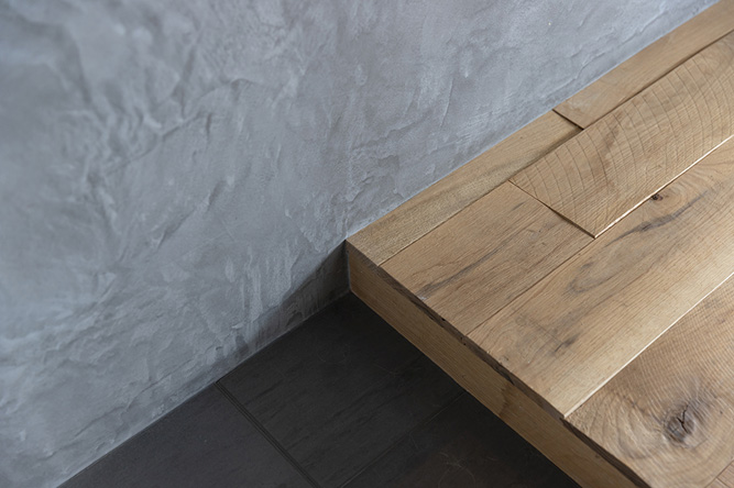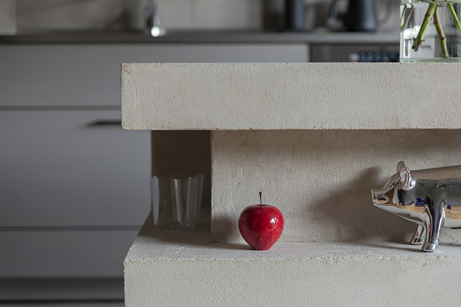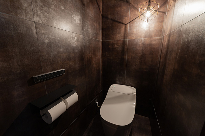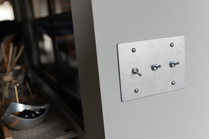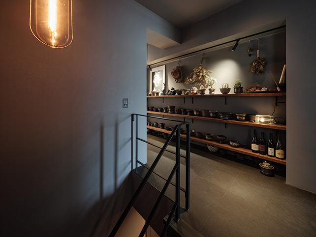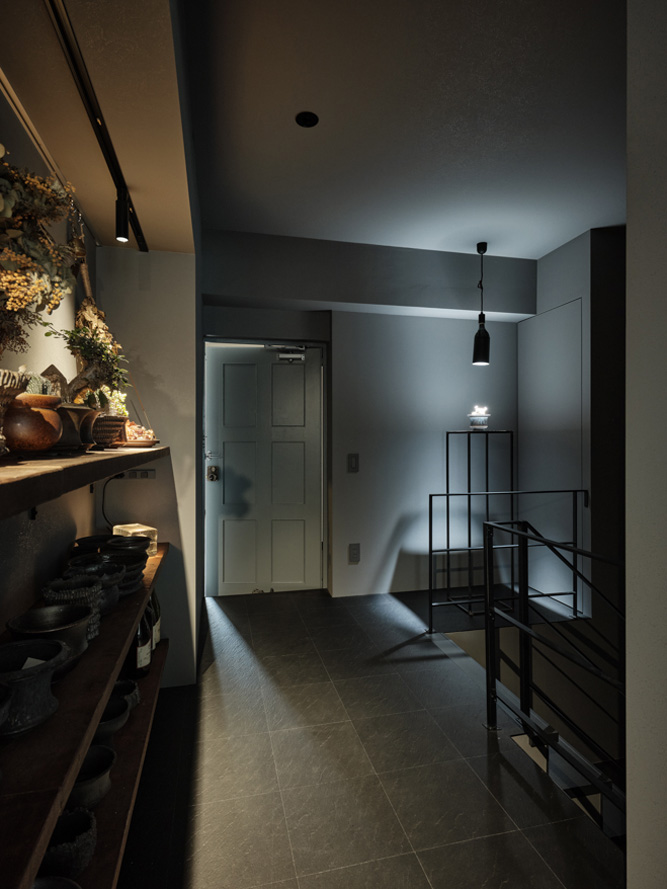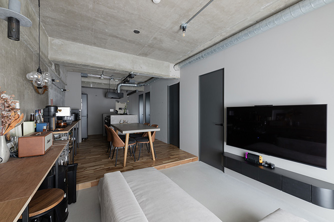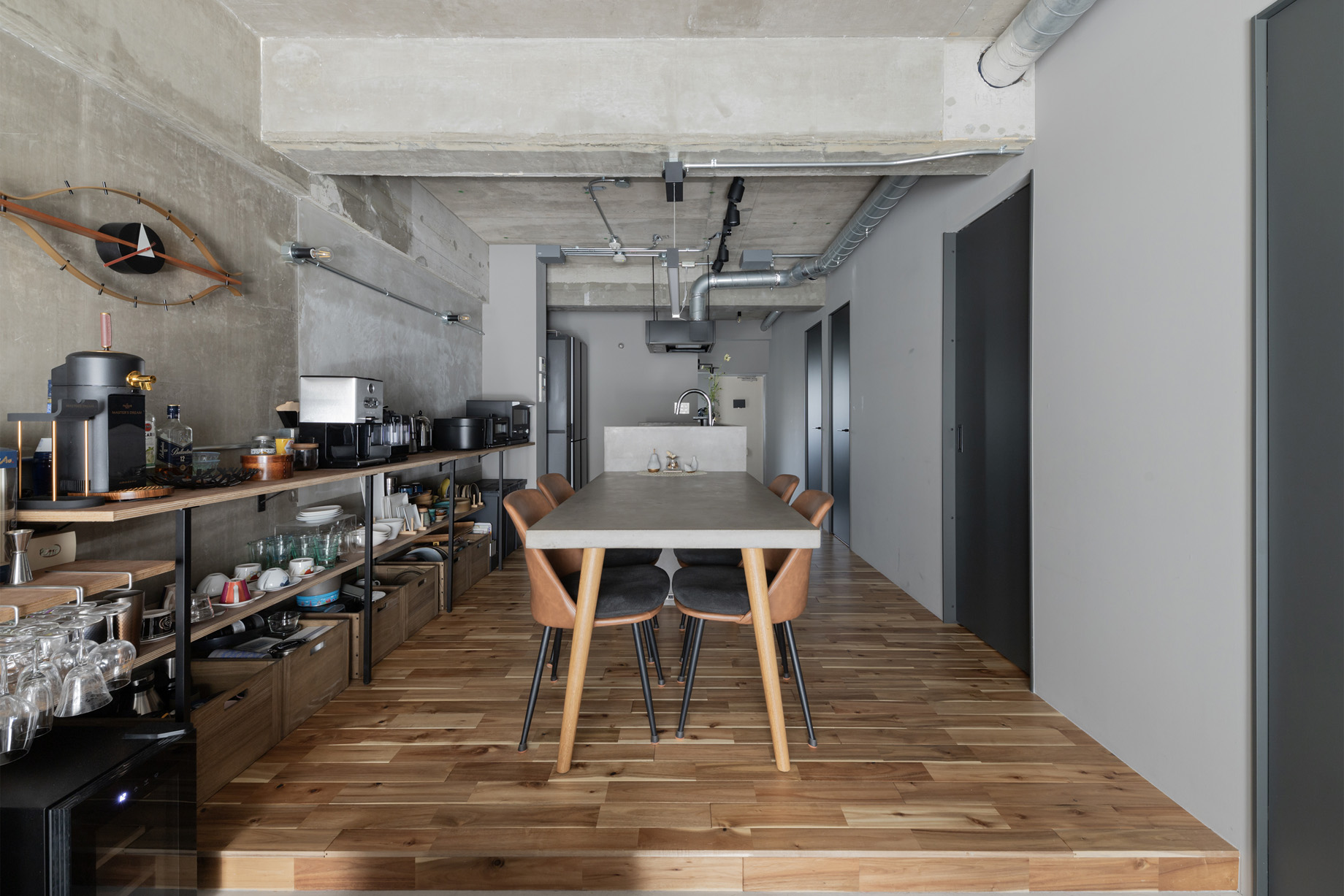 インテリアはコンクリートやモルタルといった無骨な素材を取り入れつつもラフになりすぎないように、塗装仕上げの壁やマットなブラックをドアに取り入れて全体の雰囲気を引き締めるなど、工夫を凝らしつつも面白さを感じる仕上がりに。