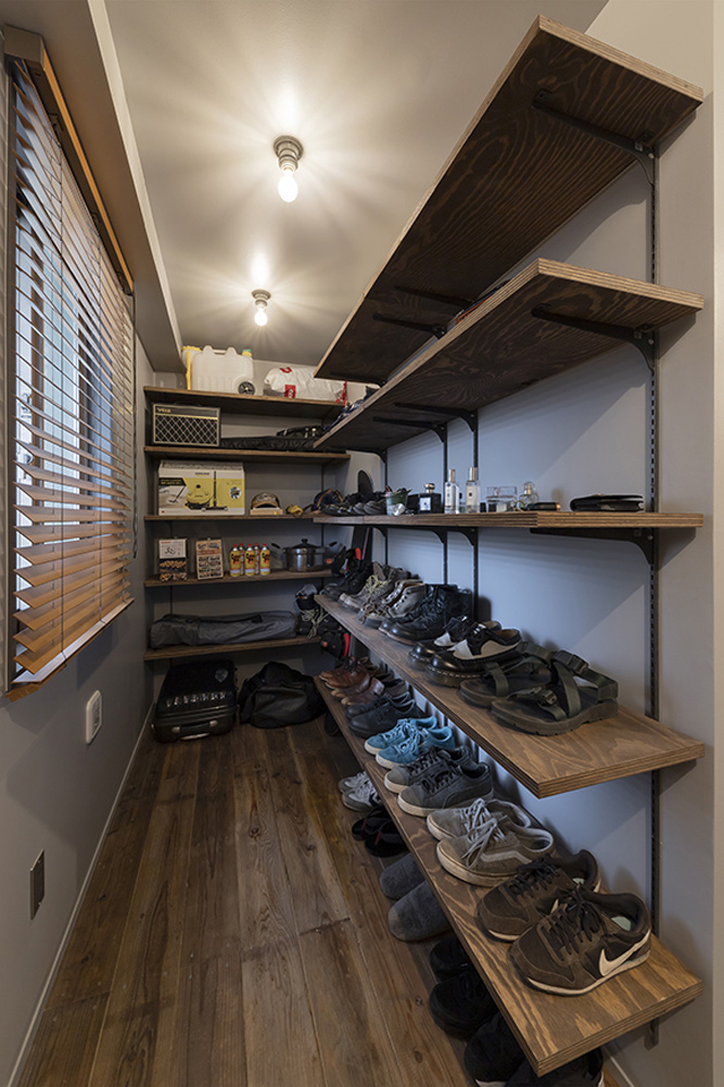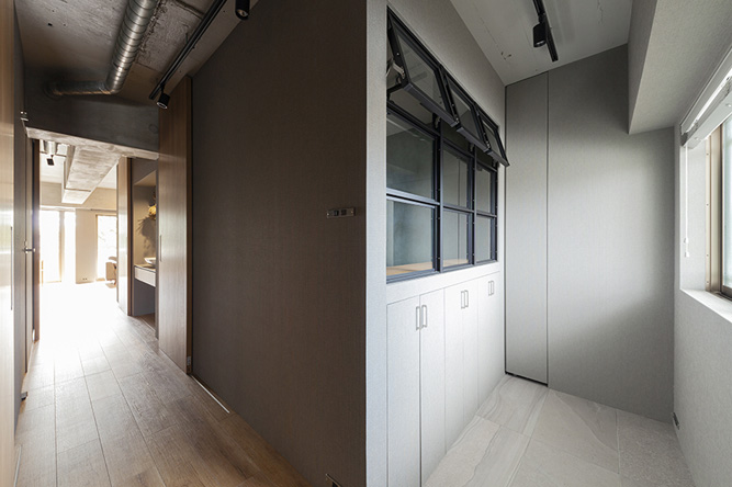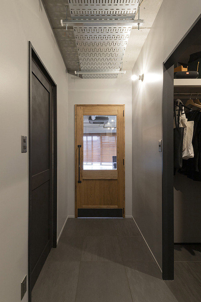 玄関には広い土間を設け、主寝室と土間の境には大きな室内窓を設置。廊下は敢えて広くすることで空間に広がりが生まれ、部屋の一部として贅沢なスペースに。