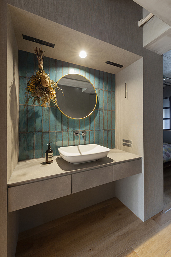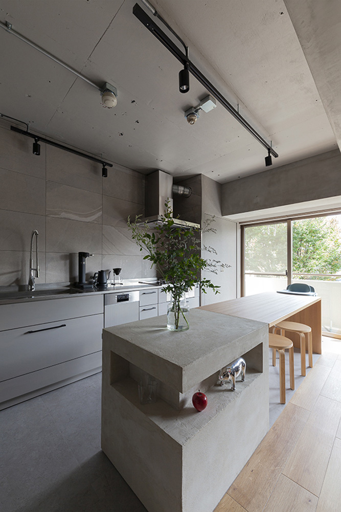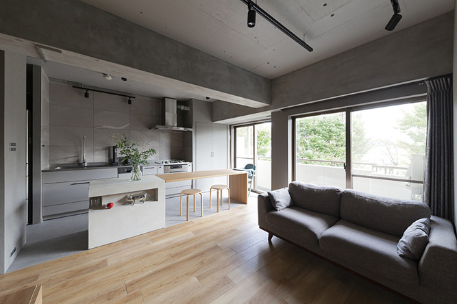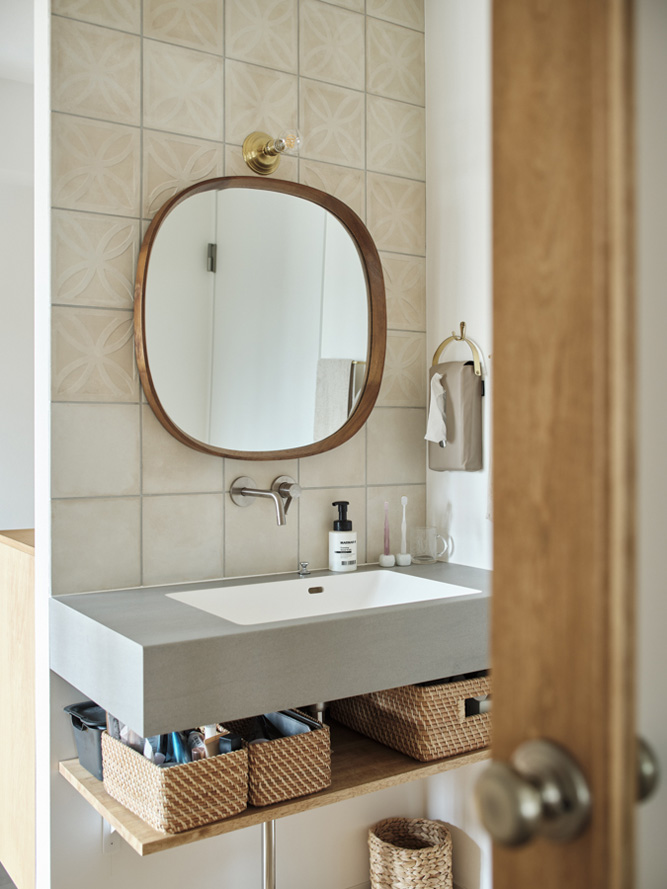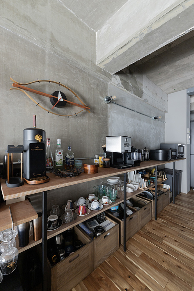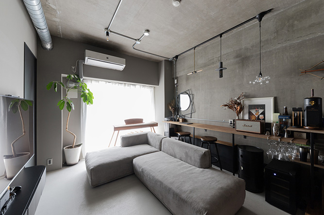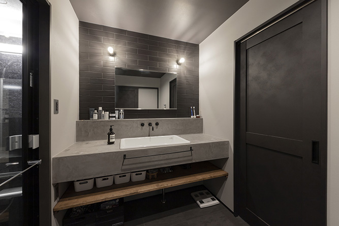 天井や一部壁面はコンクリート躯体を現しにし、無機質な素材と木の温かみがある素材のバランスを取り、経年変化や傷も味わいに変わる空間となりました。洗面台はモールテックスと病院用シンクを組み合わせて造作。変化も楽しみつつ、かっこいい暮らしに。