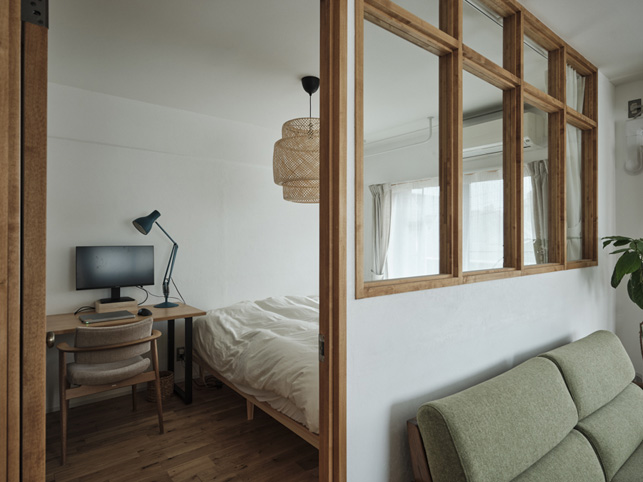「実家で使われていた古建具のガラスを再利用したい」という想いのもと、キッチンと寝室とを繋ぐ明かり取り窓として再利用し、キッチンにも光が届くようになりました。