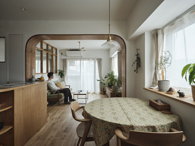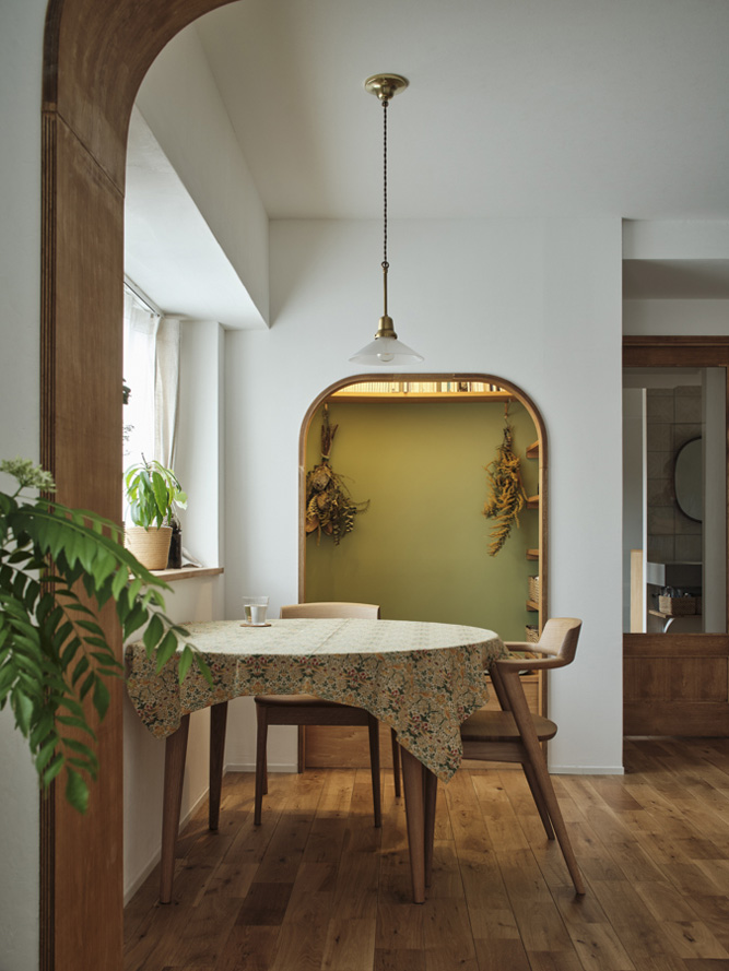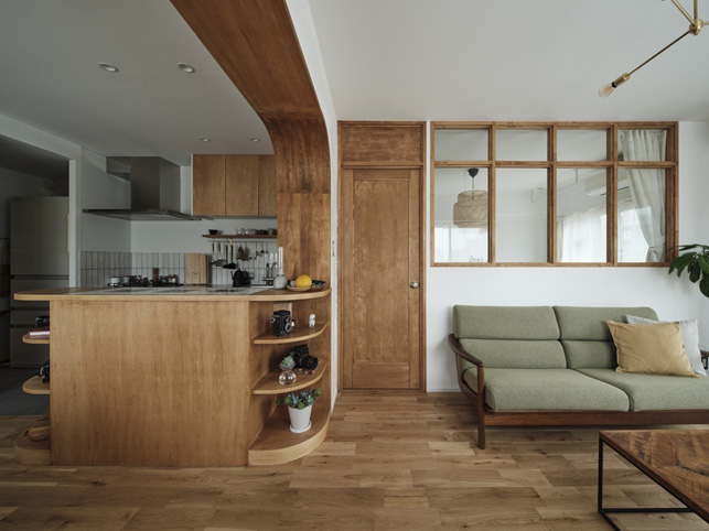 リビングを横断する梁の存在感をやわらげるためにアーチ開口を採用し、角のアールの丸みをヌックと合わせることで統一感をプラス。キッチンはふたりで一緒に作業できるよう、壁付けキッチンに加え作業台を対面に設置しました。