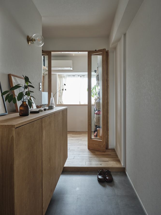 扉の設けられていないLDKには廊下からの一体感も生まれ、玄関からLDKまでが一繋がりとなり余裕の感じられる空間になりました。