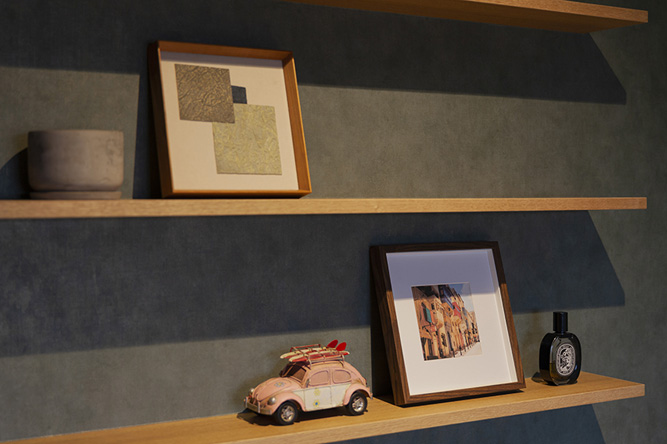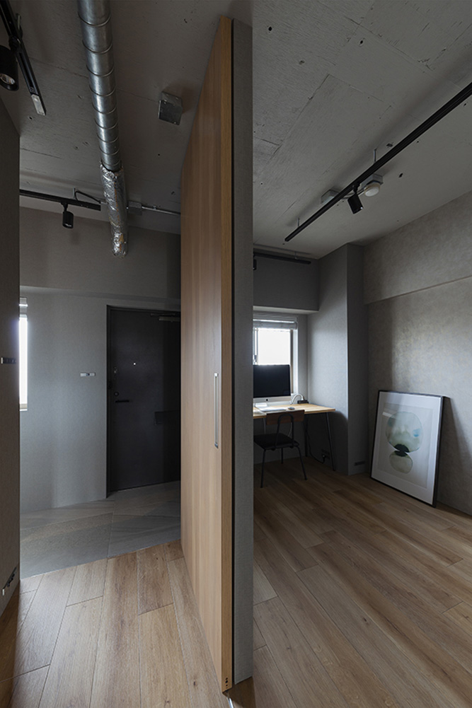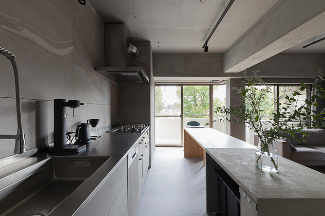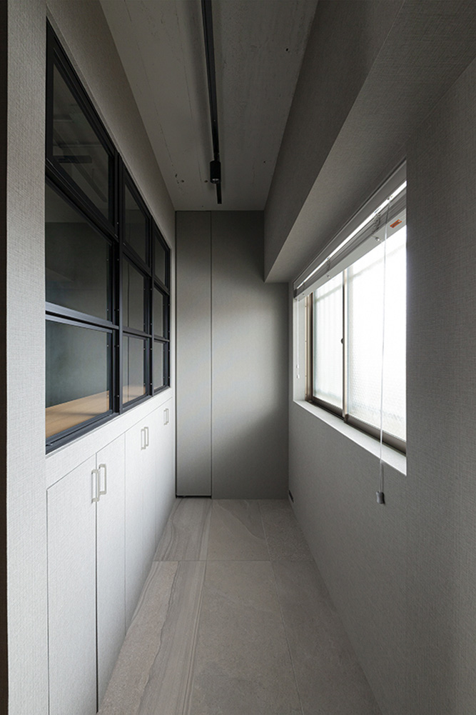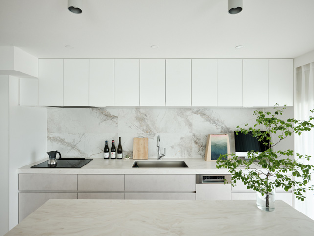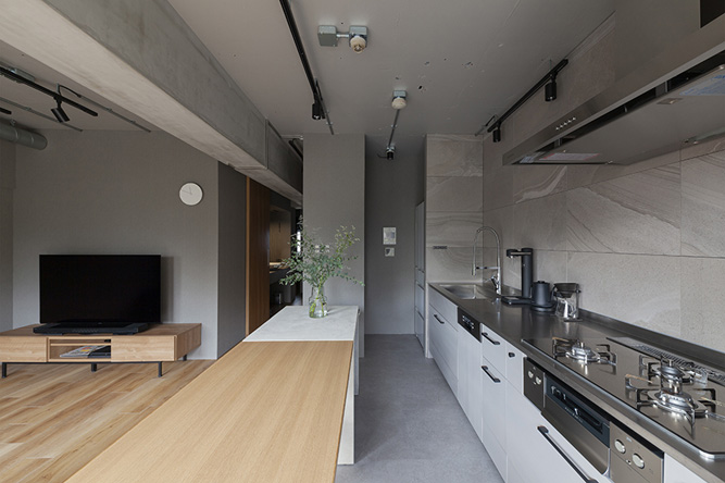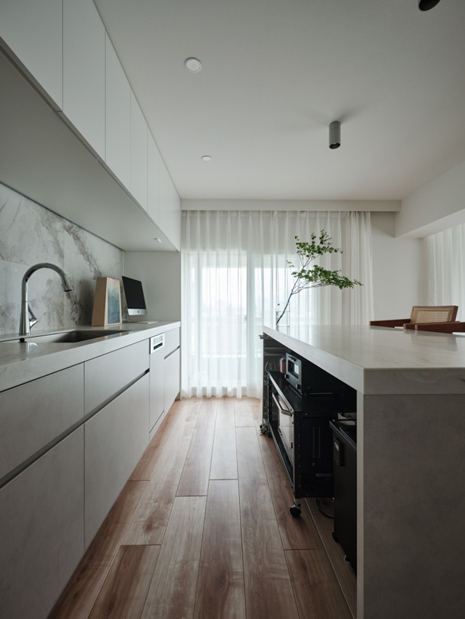 巾木や枠等の凹凸を徹底排除し、フラットな印象を受けるミニマルでノイズレスな仕上がりを実現。色の数やトーンは抑え気味にしてテクスチャーとカラーリングの組み合わせや細かいディテールにこだわり抜きました。照明はダクトレールを敢えて吊り下げることで高さ方向の余裕が生まれ、ホテルのような雰囲気を演出。リビングまでのアプローチである廊下兼洗面スペースには、2m50cm超の迫力あるフルハイトドアが並び、ダイナミックな印象に。キッチンは使い勝手の良い大型のI型キッチンを配置。グリーンやアートが映えるミニマルで洗練された住まいが完成しました。