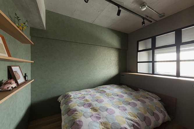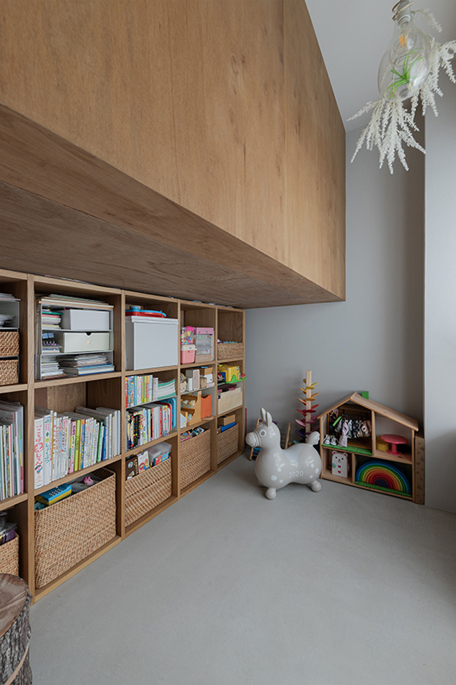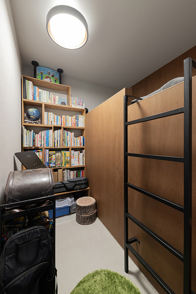 汚れや傷を気にせずに使えるモルタルをリビングエリアと子ども部屋の床に採用。子ども部屋では2段ベッドのようにベッドスペースを上下互い違いに配置することで空間を間仕切り、限られたスペースでも個室2部屋を確保しました。