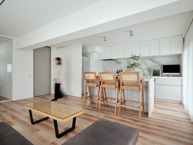 家に入ると縦長なLDKが目の前に広がるこちらの住まい。物件の広さや家族4人暮らしを考慮して、室内廊下がない間取りに。LDKの壁際にある長いカウンターはキッチンでは家電や食器収納に、ダイニングではバーカウンターに、リビングではお子様の勉強机にと、エリアごとで使い方が変化します。空間に統一感を出しながらも使い方を限定しない、生活に欠かせないスペースです。自然とみんながLDKに集まり、誰がどこにいるのかを感じられる。家族のライフスタイルが反映された住まいとなりました。