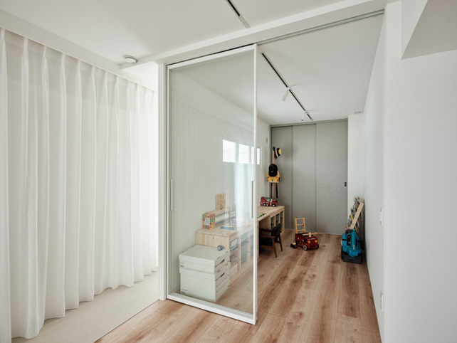 透明な境界で区切りつつも光がめぐり、お互いの存在感を感じる住まいに。