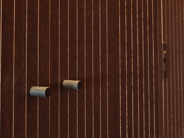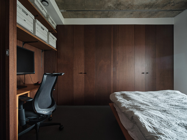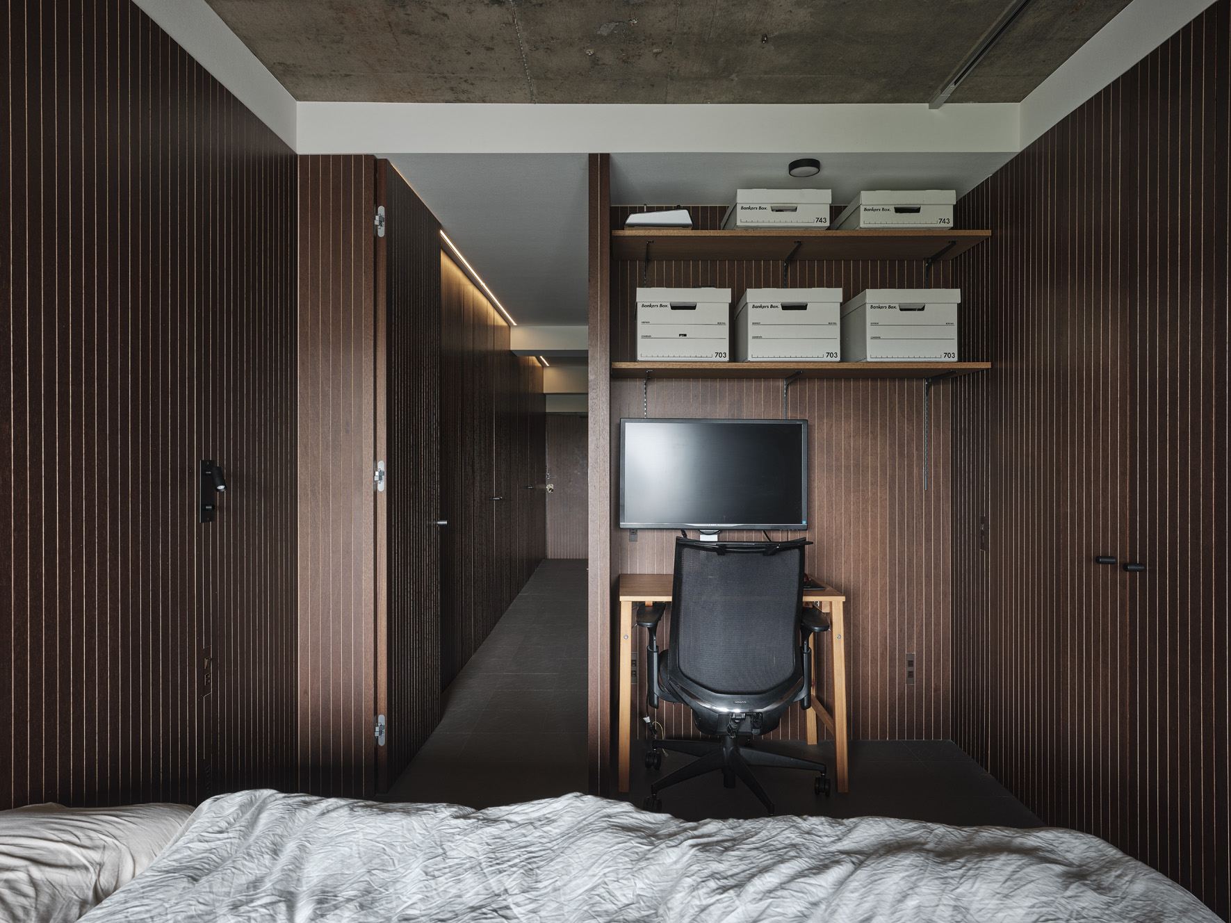 ディスプレイスペースは構造壁を間仕切り壁として配置したり、浴室やトイレといった区切りが必要なスペースも構造壁で囲うことで最大限に活用しました。上フロアでは建具を天井高さに合わせ、実際よりも高く感じるよう演出。下フロアでは壁面に連続したスリットデザインを用いて縦方向への広がりを強調することで、ネガティブに捉えがちな特徴をデザインでカバーするリノベを実現しました。