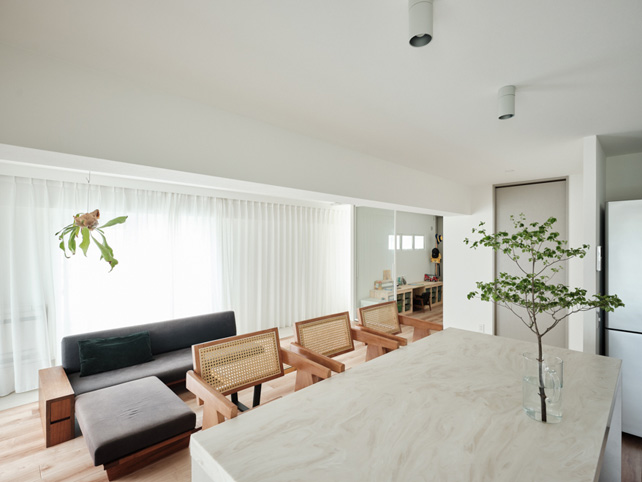 下フロアは寝室や浴室を配置したプライベートスペースとし、オリジナルモデュールの”tatema”により、フロア全体に一定のリズムを作り出しています。上フロアは白を基調としたLDKが広がります。窓と壁いっぱいに連なるカーテンは柔らかいテクスチャが空間を明るい印象に。「上フロアで過ごす子どもが夜になると下フロアで過ごすことで入眠がスムーズになり心身のリズム調整に役立っている」と、空間にメリハリをつけたリノベでは生活リズムを整える効果をもたらしました。